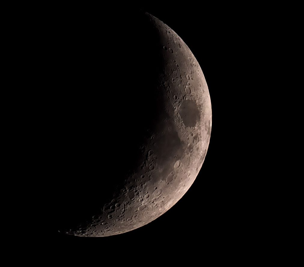 Der Mond ist der einzige natürliche Begleiter unserer Erde. Da er sich genau einmal um sich selbst dreht in der gleichen Zeit wie er die Erde umkreist, sehen wir ihn immer nur von einer Seite. Er reflektiert das Sonnenlicht und je nachdem wie er zur Sonne steht, sieht man die verschiedenen Mondphasen. Auf diesem Foto seht ihr eine zunehmende Mondsichel. Dies ist eine Mondphase kurz nach Neumond.