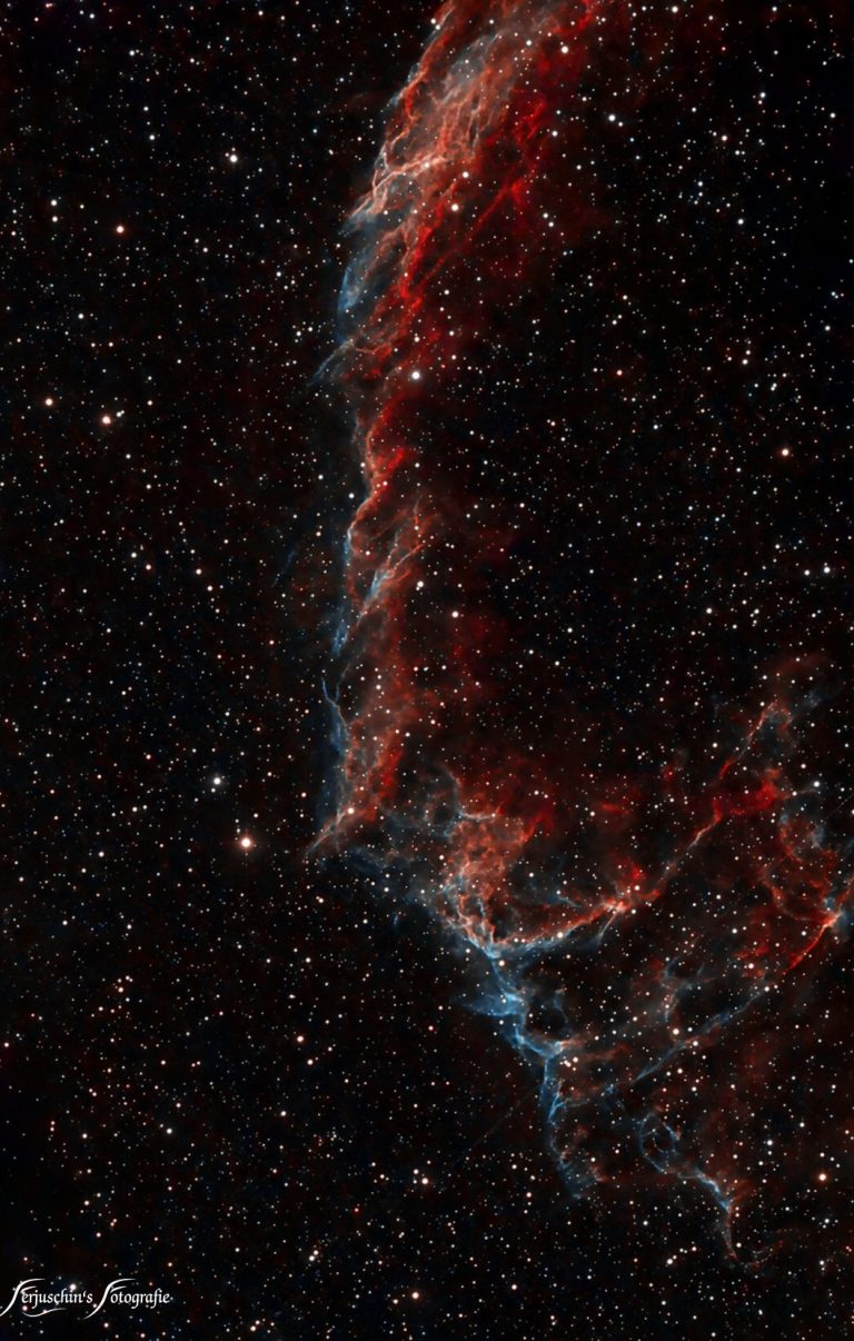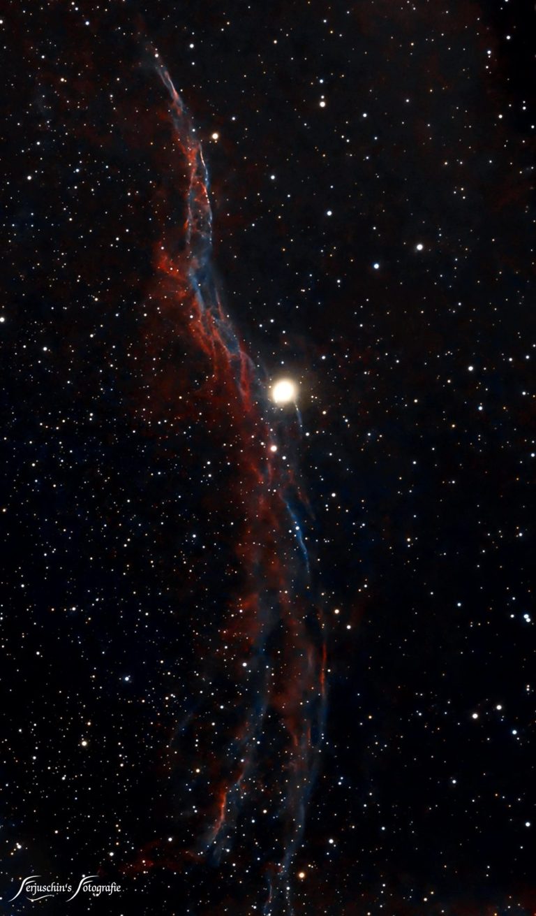 Auch der westliche Cirrusnebel liegt im Sternbild Schwan mit einer Entfernung von ca. 2500 Lichtjahren. Der Cirrusnebel-Komplex ist ein Überrest von einer ca. vor 8.000 Jahren stattgefundenen Supernova.