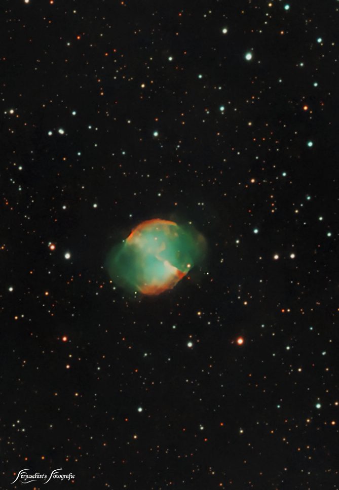Schön anzusehen ist der Hantelnebel im Sternbild Fuchs. Es handelt sich hierbei um einen planetarischen Nebel mit einer Entfernung von ca. 1.360 Lichtjahren.