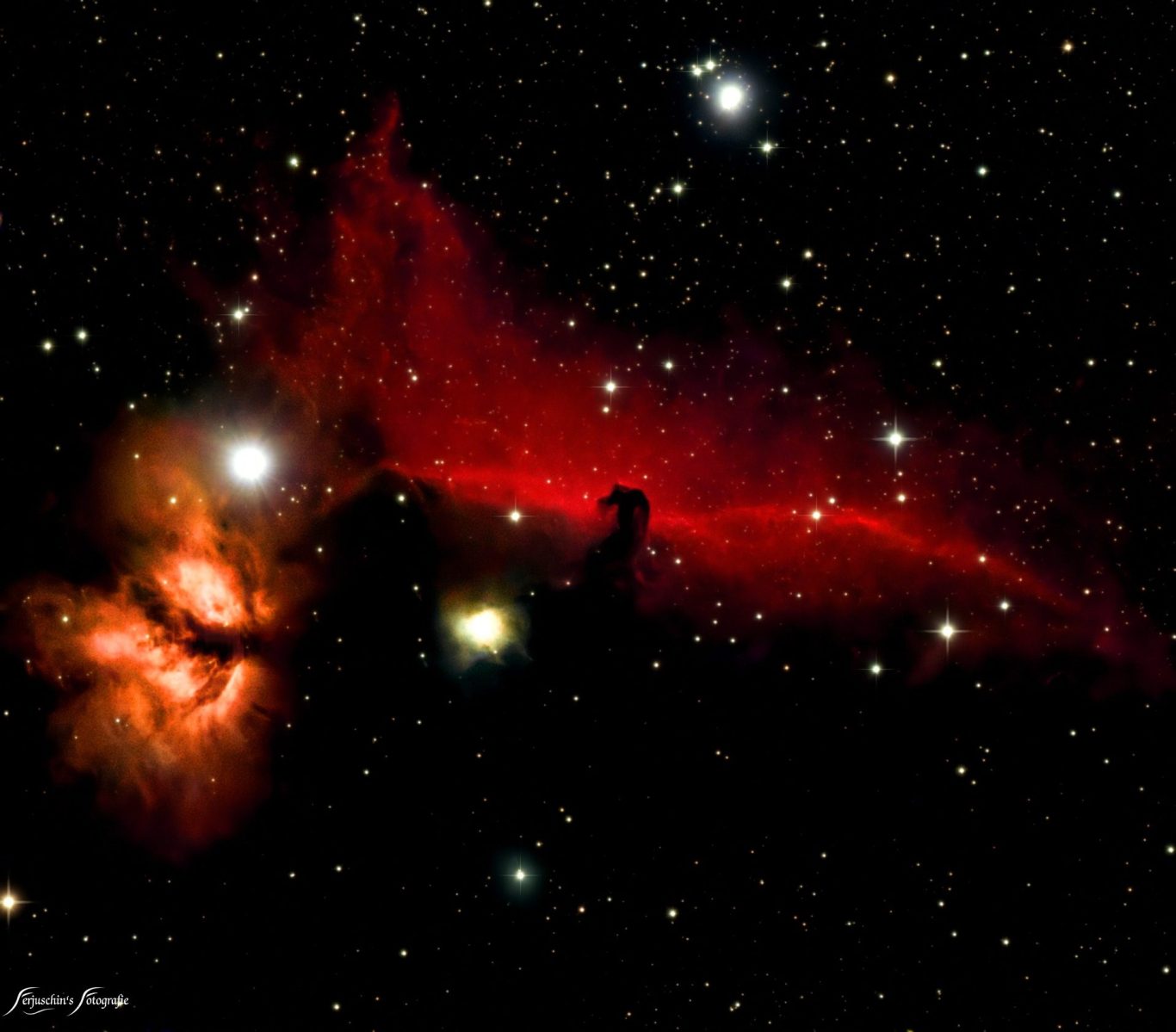 Im Sternbild Orion findet man einige wunderschöne Nebel. Unübersehbar ist hier der Pferdekopfnebel - links davon der Flammennebel.